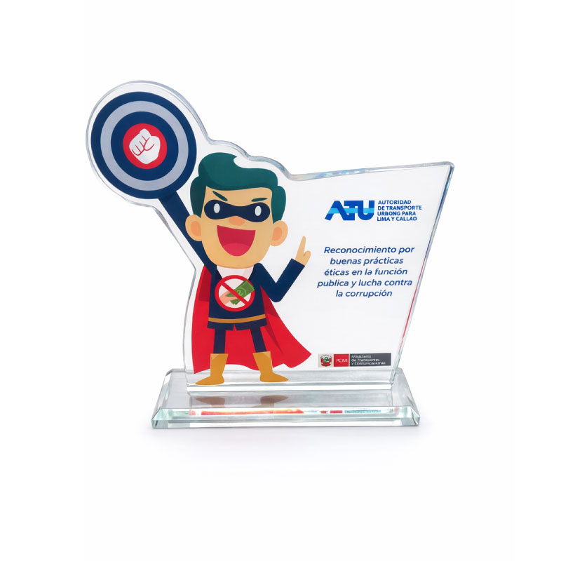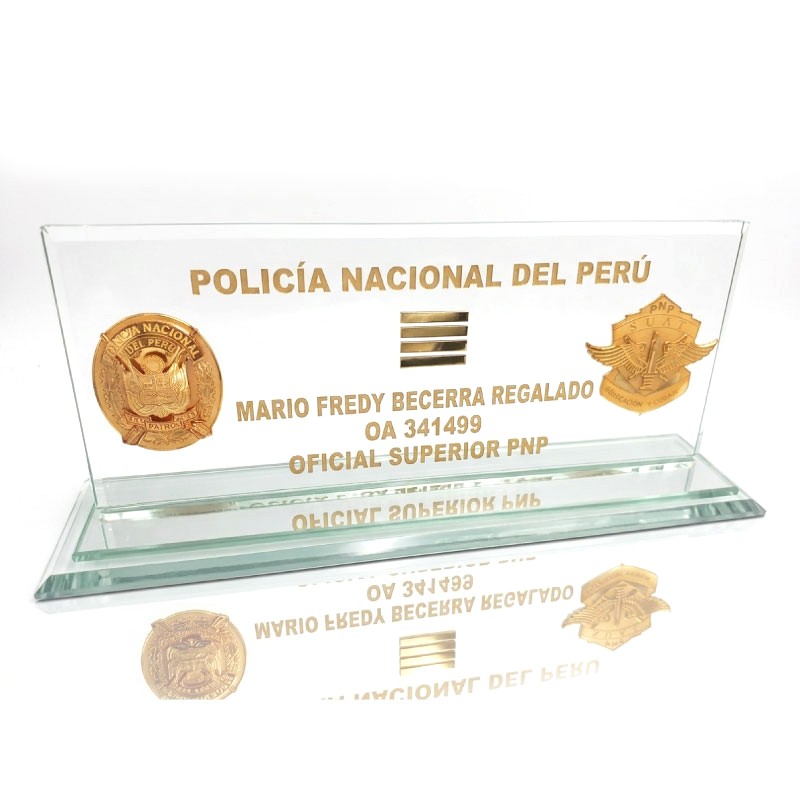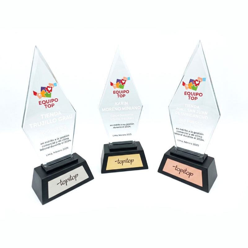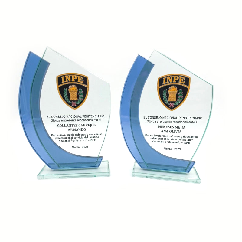 El trofeo de vidrio es una distinción elegante y transparente que honra logros sobresalientes. Su diseño cristalino simboliza la claridad de los éxitos, destacando la excelencia y la dedicación merecidas.